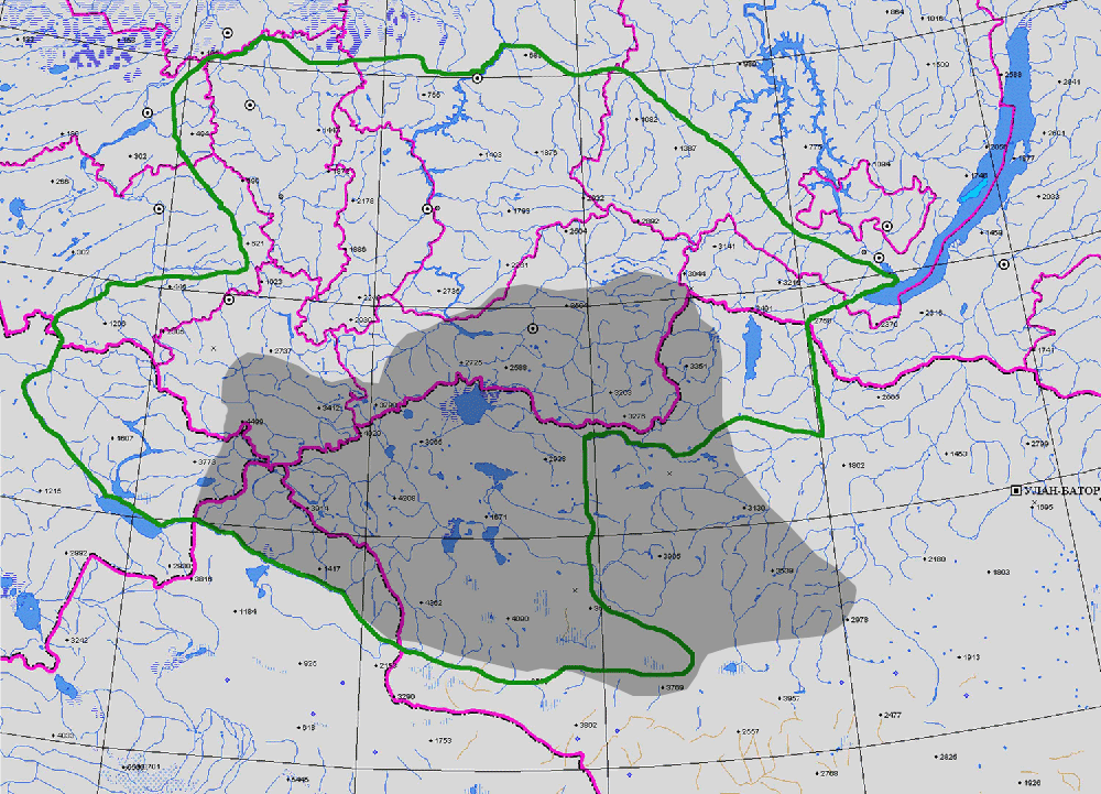 ГЕОГРАФ. АРЕАЛ: плато Укок, хр. Катунский, хр. Курайский, хр. Северо-Чуйский, хр. Хангай, котловина Курайская (2).